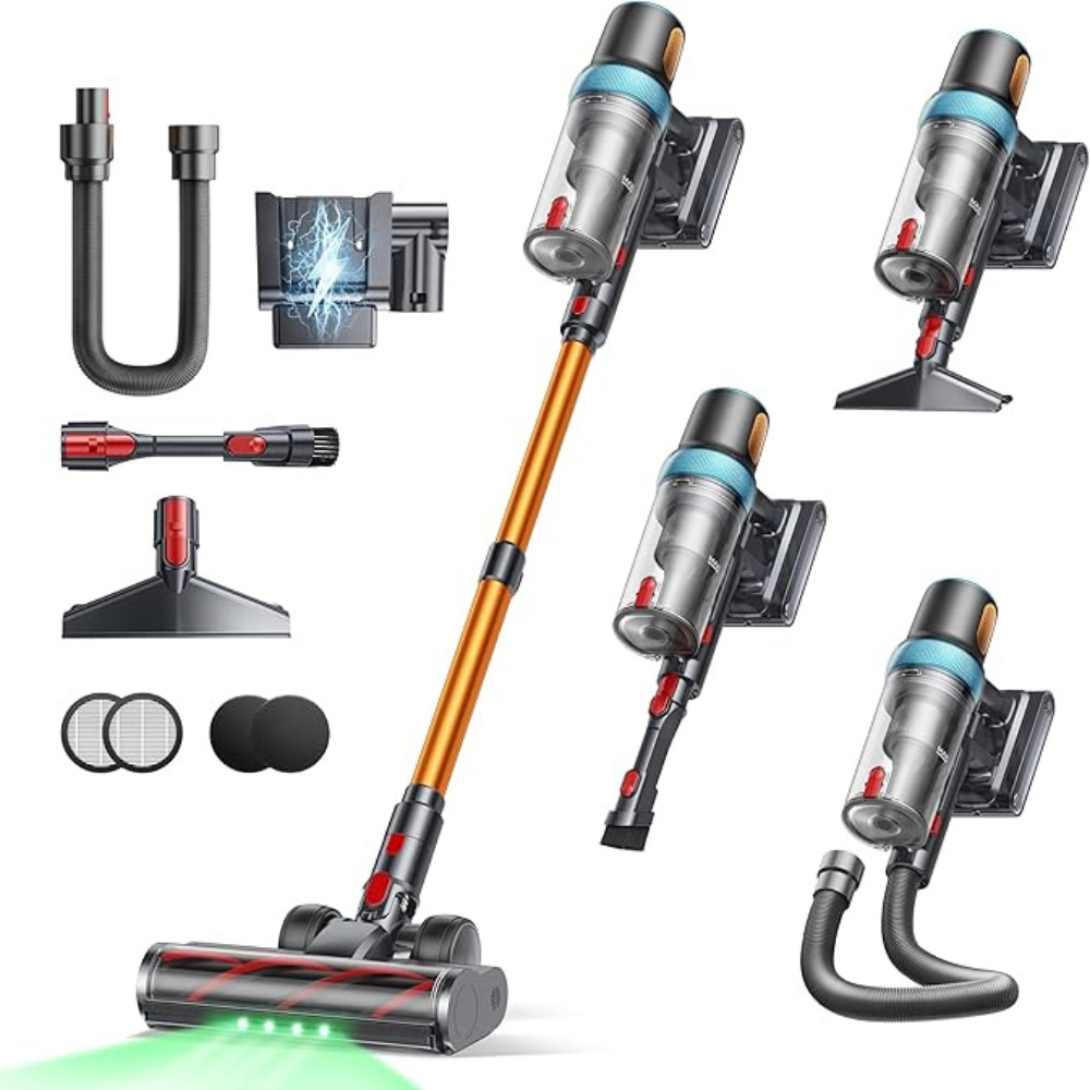 Equipado con un sensor inteligente de polvo, el aspirador ajusta automáticamente la potencia según el nivel de suciedad detectado. El cepillo antienredos y el tubo LED con luz verde permiten una limpieza profunda y visible incluso en las zonas más oscuras.